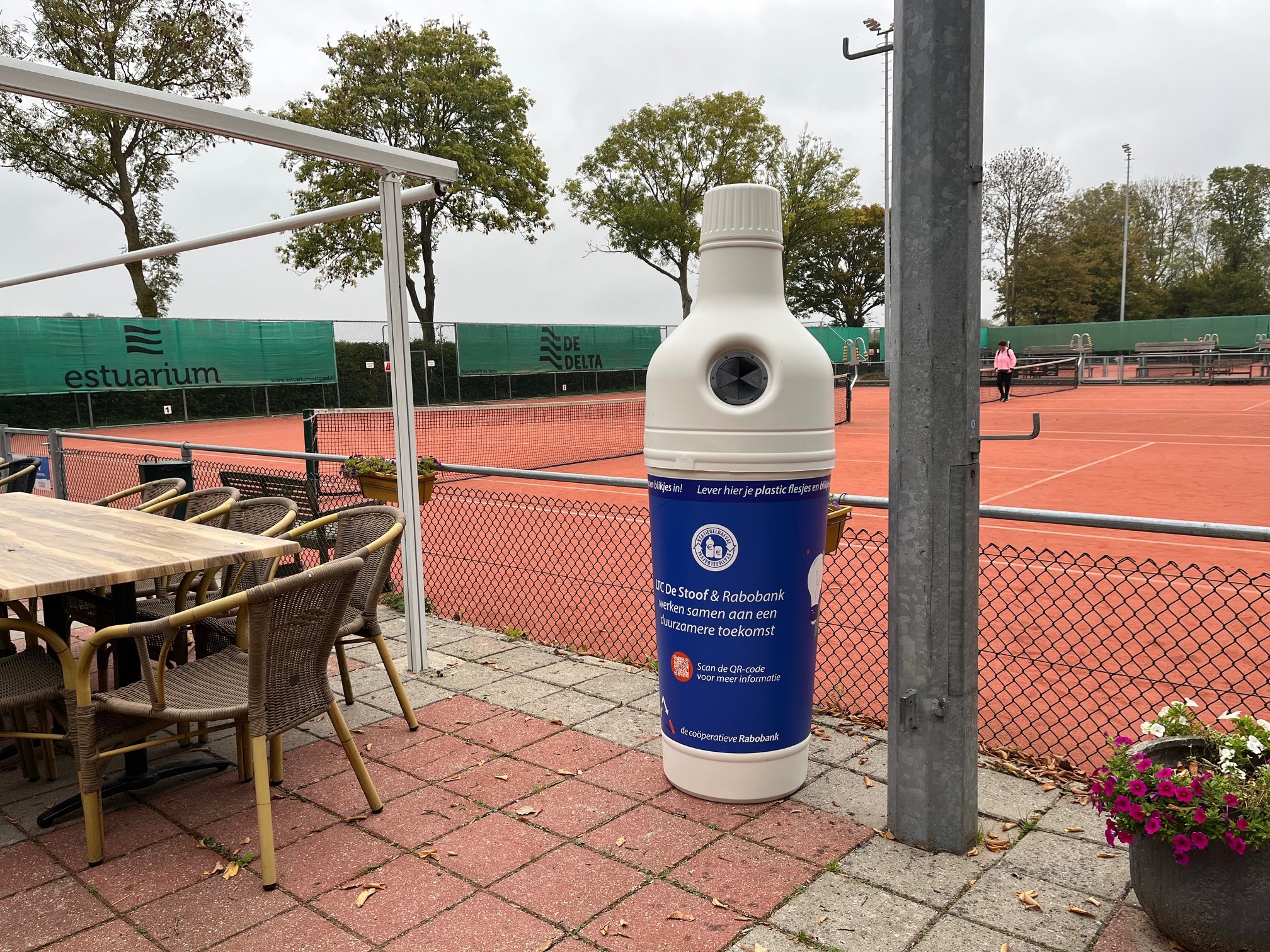 Hebben jullie hem al zien staan? We hebben van de Rabobank een megagrote PETman-fles gekregen voor het inzamelen van lege plastic statiegeldflessen. Goed voor het milieu en onze portemonnee.